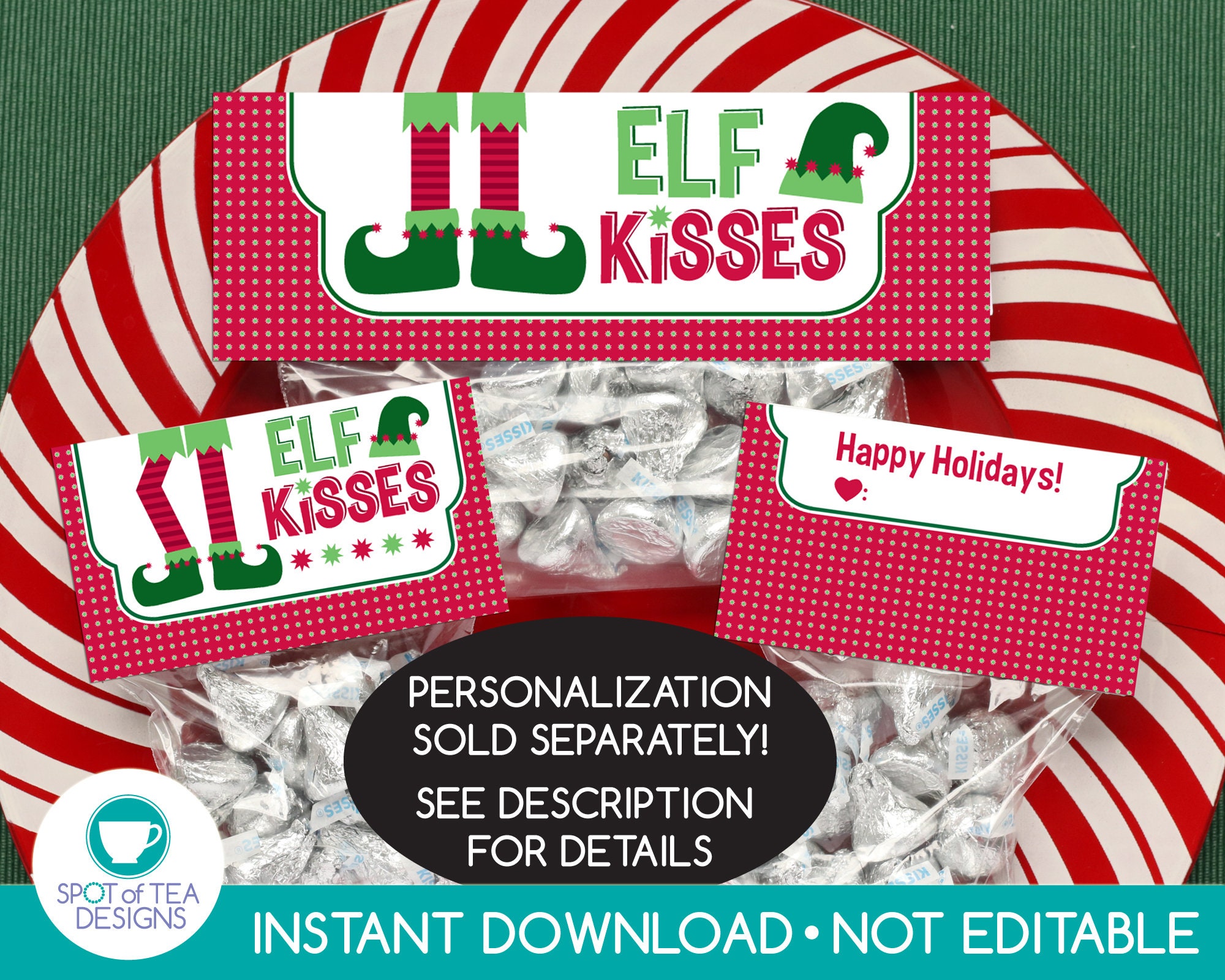 Elf Kisses Santa Claus Christmas Gift Tag Sticker Labels, 40 2" Party Circle Stickers by AmandaCreation, Also Great for Envelope Seals & Gift Bags